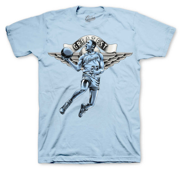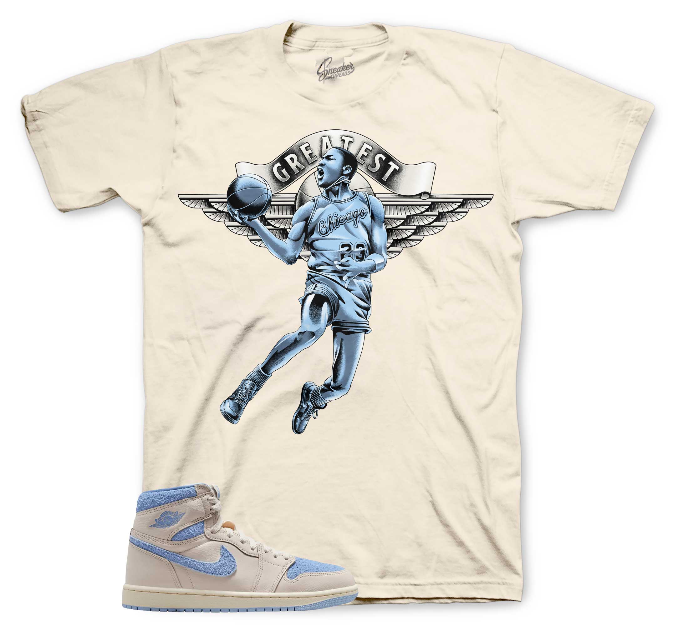 Sneaker shirts to match your Jordan Retro 1 psychic blue in sail | sneaker outfits.
