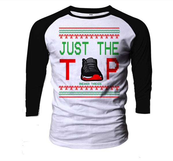 Ugly Christmas raglan shirt with sneaker themes.